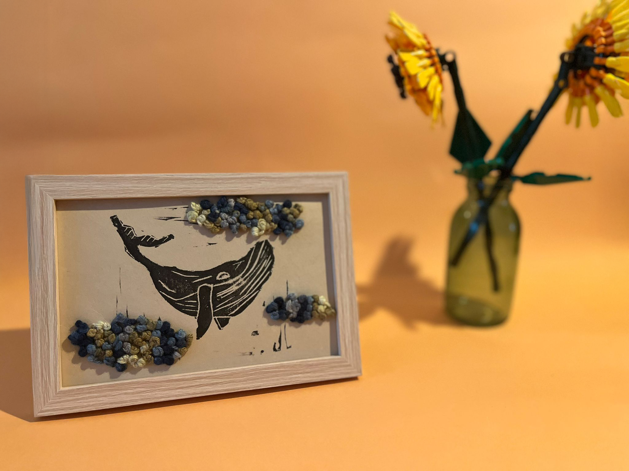 Linogravure et broderie, vendu avec cadre environ un A6
