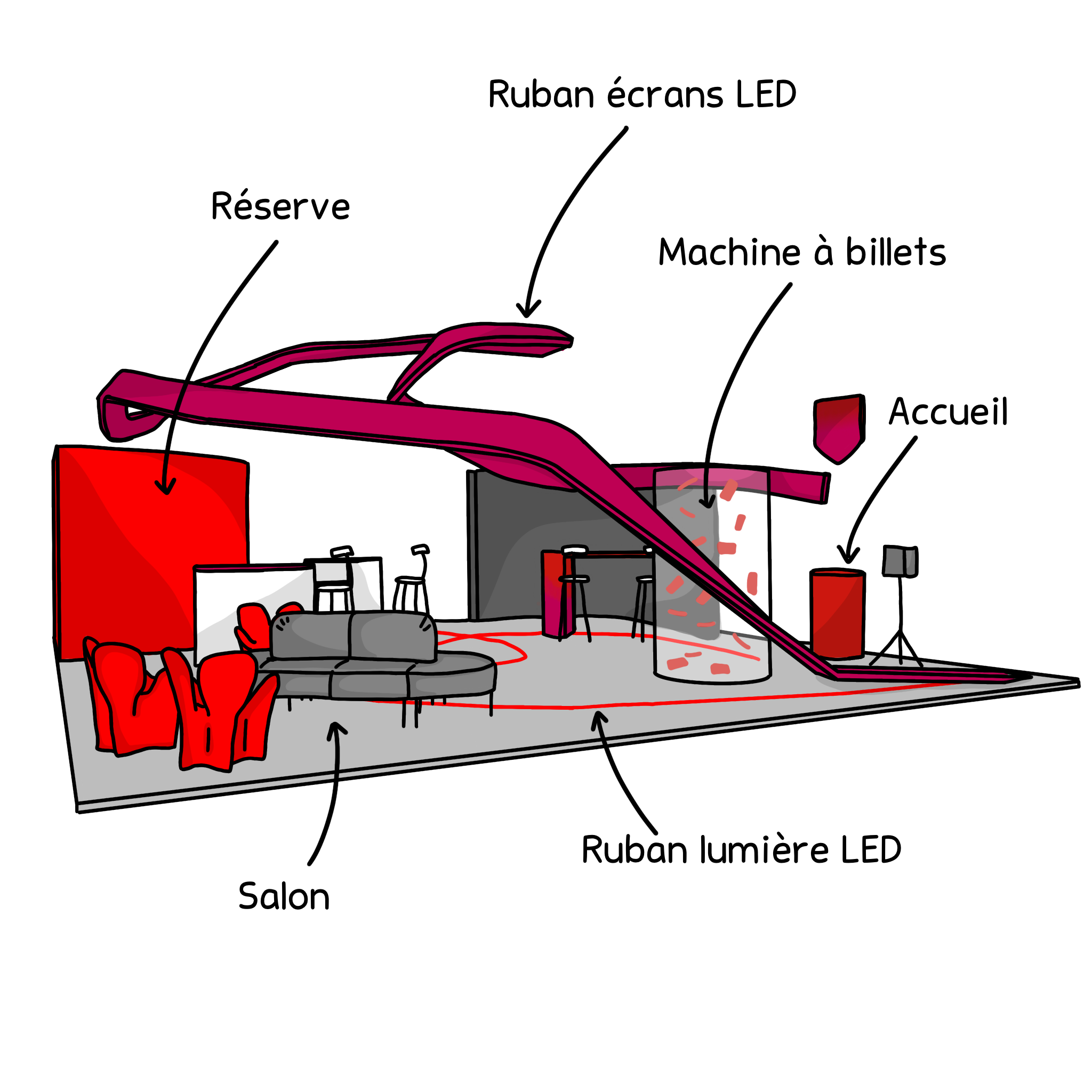 Ce schéma représente un stand d’exposition structuré autour d’un parcours fluide et immersif, guidé par une ligne rouge au sol qui accompagne les déplacements des visiteurs.