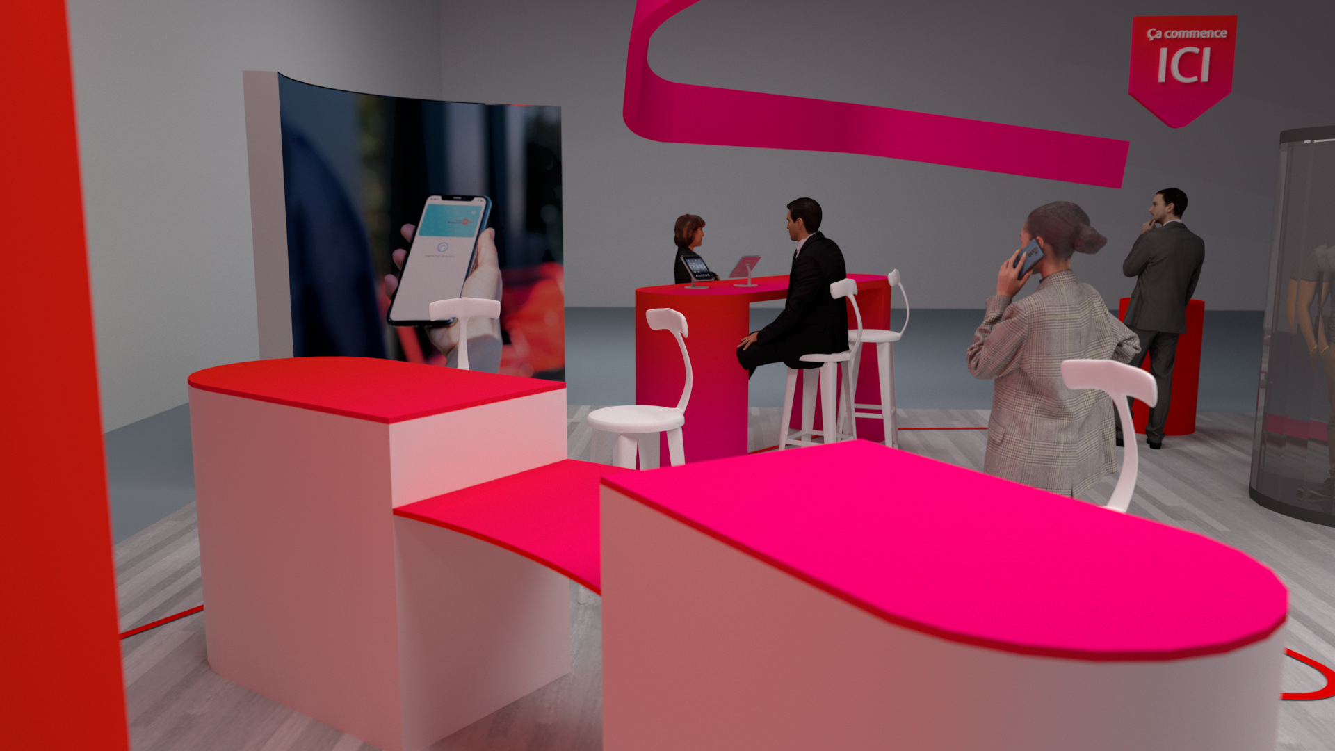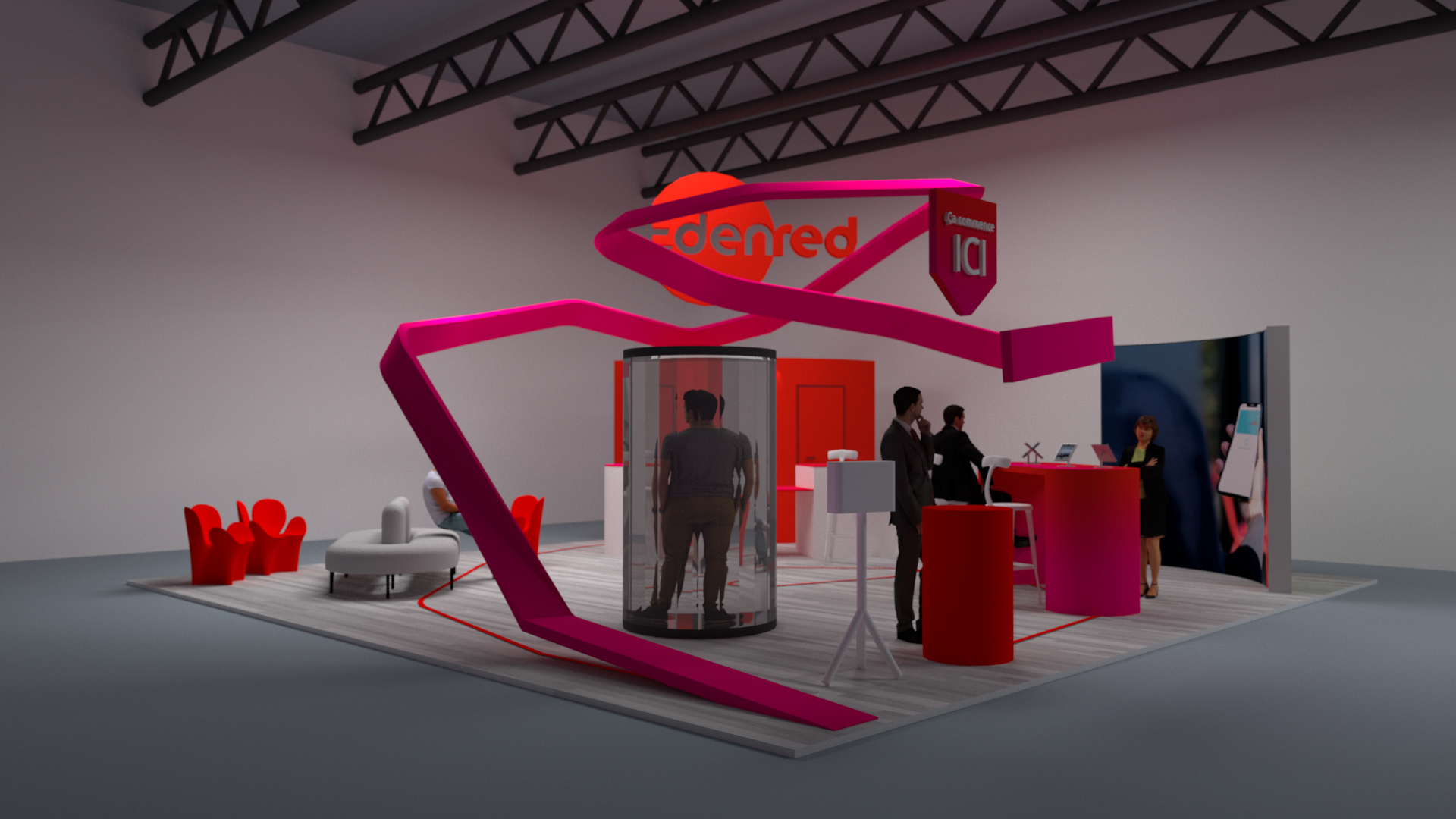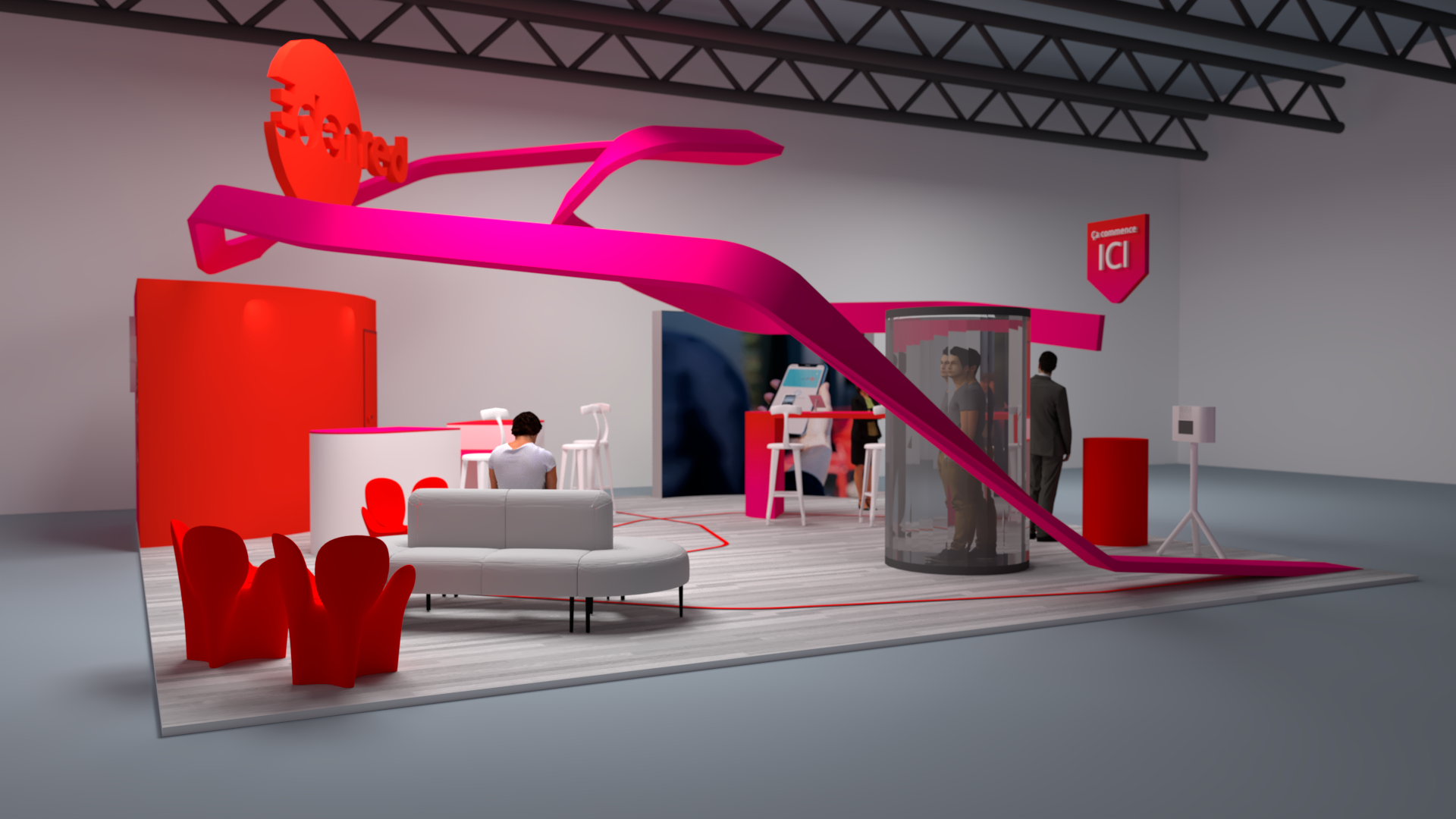 Un ruban architectural composé de LED suspendu, aux formes organiques et dynamiques, traverse l’espace du haut vers le bas, créant une identité forte et un repère visuel visible de loin. Il relie les différentes zones du stand tout en apportant une sensation de mouvement et de continuité.