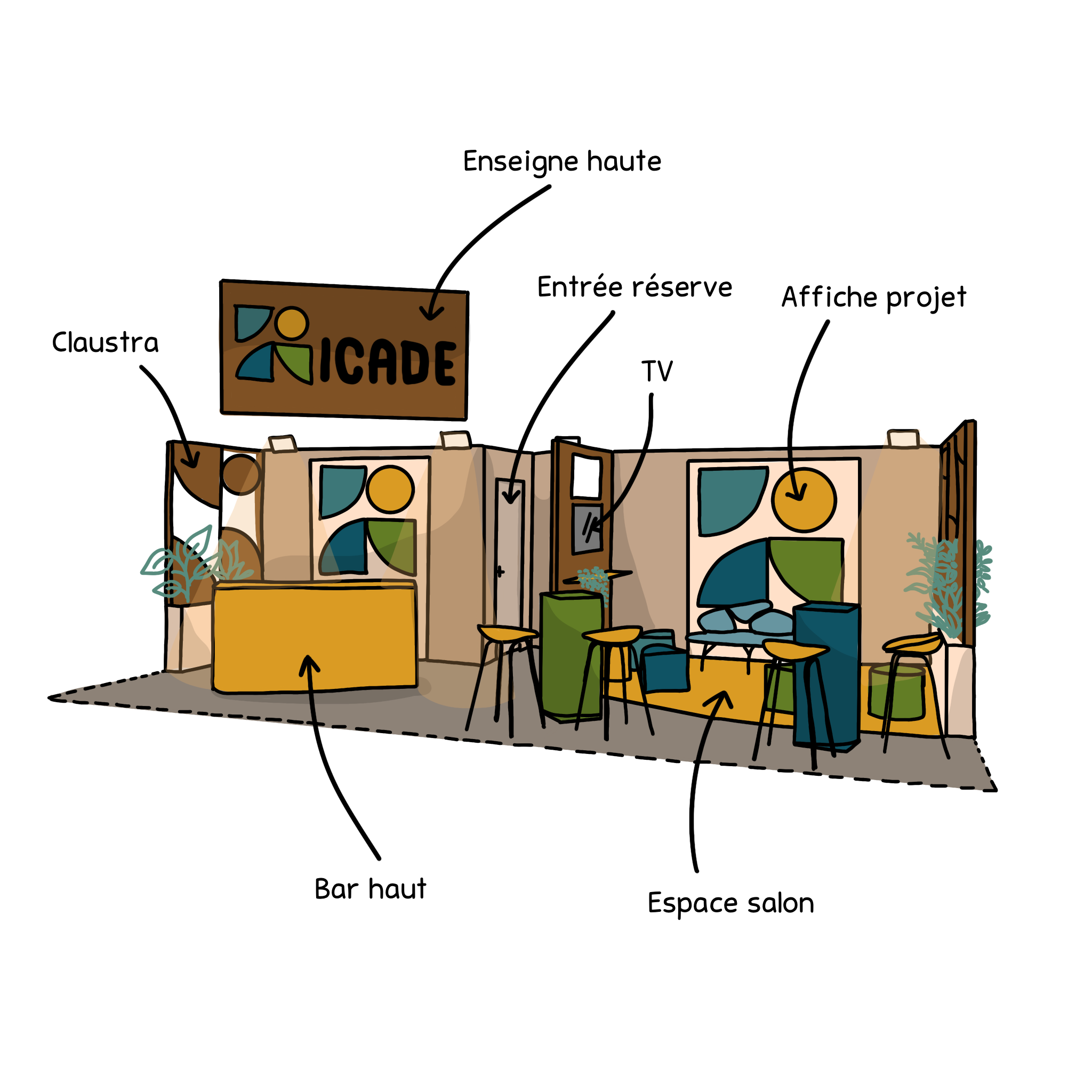 L’agencement s’articule autour de trois zones complémentaires : un comptoir d’accueil ouvert et accessible, un espace d’échange dynamique avec tables hautes favorisant les interactions rapides, et un coin plus confortable propice aux discussions approfondies. Cette diversité d’usages permet de répondre aux différents temps de la rencontre sur un salon. Le stand joue sur des volumes simples et modulaires, ponctués de touches végétales, pour créer une atmosphère chaleureuse et contemporaine.