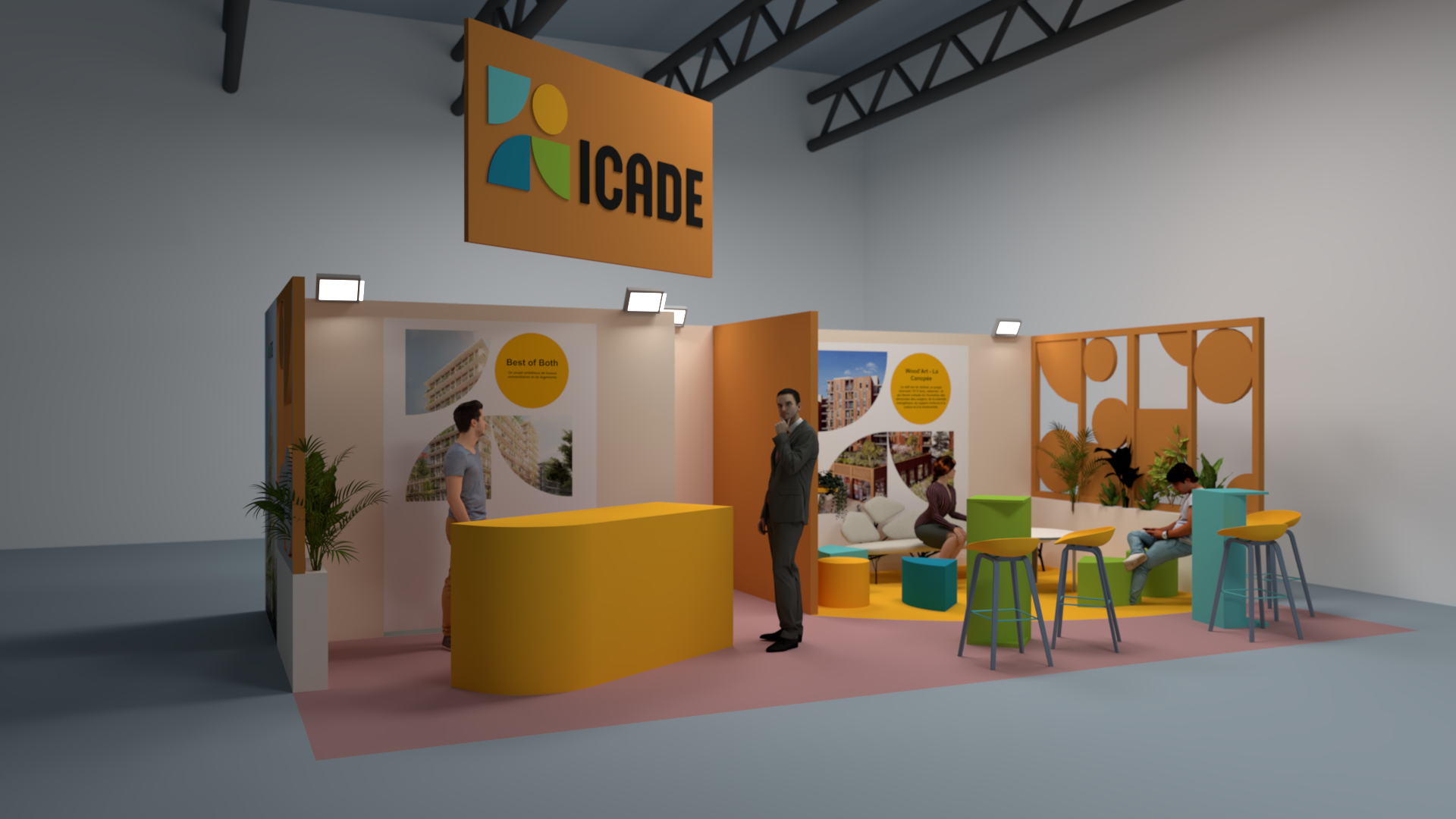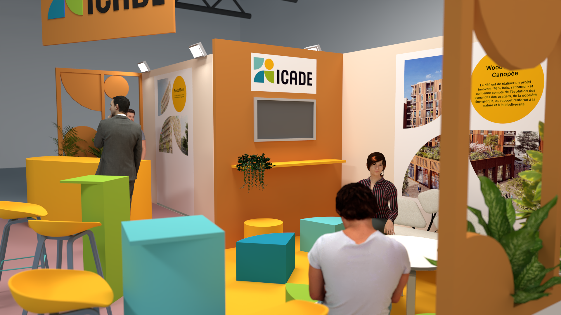 Conçu pour l’entreprise Icade, ce stand propose un espace à la fois accueillant, lisible et structuré, où chaque élément participe à créer du lien avec les visiteurs. L’identité visuelle de la marque est déclinée à travers des formes graphiques colorées et reconnaissables, intégrées aux panneaux et au mobilier pour renforcer l’impact et la mémorisation.